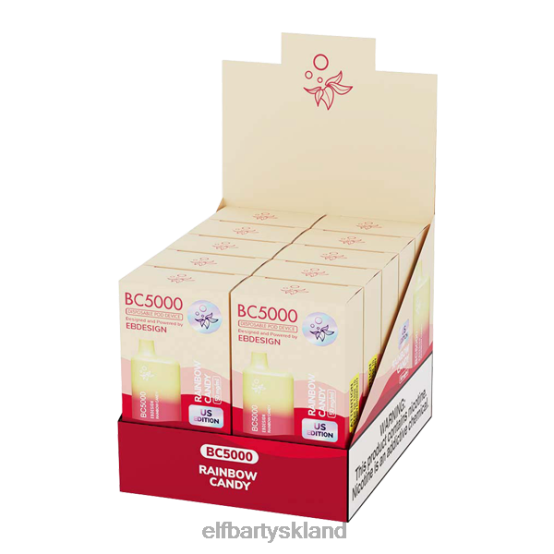 engangsvaporizer-smag: regnbue-konfekten ebdesign bc5000 giver 5.000 pust af blandede søde frugtsmag. denne bedst sælgende engangs vape smag er også genopladelig for at gøre den til en langtidsholdbar vape enhed. nikotinniveau: 0mg & 50mg pust pr. enhed: +5000 gennemse flere engangsvapesmage